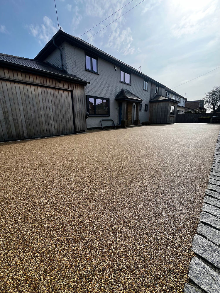 This recent project in Whitstable showcases a professionally installed resin bound driveway by Varney Surfaces, combining strength, permeability, and a high-end finish. The surface features a natural gravel colour, complemented by granite sett edging for a clean, defined look.